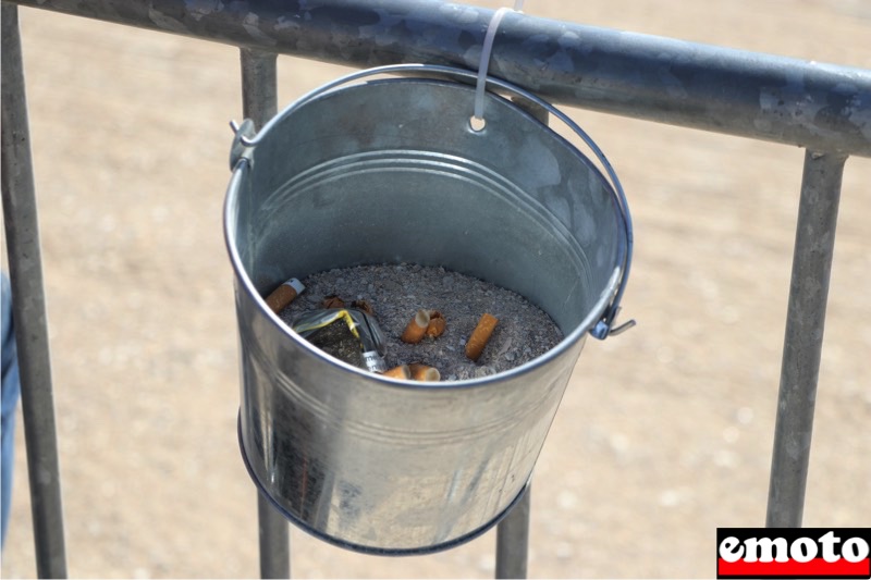 Outre le manque flagrant de poubelles, le plus étonnant reste l'absence totale de tapis environnementaux pourtant obligatoires sur toutes les manifestations extérieures, ce tapis environnemental d'un format 160 cm x 100 cm avec une capacité d'absorption d'un litre minimum et d'une épaisseur de 5 à 7 mm minimum. Le but de ces tapis est d'absorber les liquides et graisses qui s'écoulent des motos aux stands. Les moindres enduro ou trial amateur n'y échappent pas. Ici, il n'y en avait aucun. Sur la Normandy Beach Race on trouvait parfois sous les motos un bac récupérateur pour les plus consciencieux et de véritables tapis d'orient pour les plus esthètes. Mais le plus souvent il n'y avait rien.