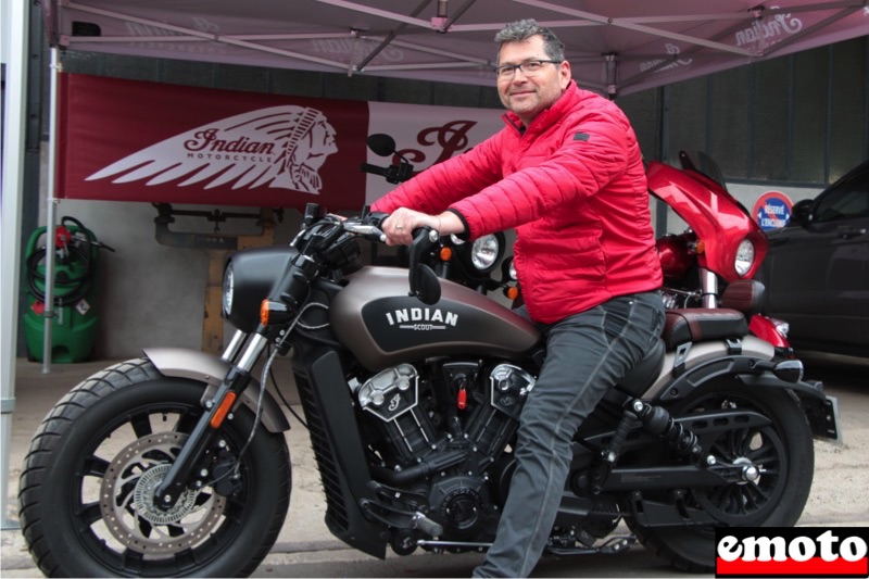 Luc : Alors moi je suis motard depuis que je suis grand comme ça. L'année dernière j'ai changé pour un scooter électrique parce que c'était purement utilitaire pour faire mon trajet domicile boulot, parce que j'ai un enfant et on ne part plus en vacances à moto comme on faisait avant. Je ne suis pas client Indian moto, j'ai découvert cette marque très récemment, vraiment par hasard, je ne connaissais pas du tout, pour moi ce genre de moto c'était plutôt Harley-Davidson parce qu'ils sont très connus et Indian moto beaucoup moins. J'ai découvert cette marque par hasard, j'ai découvert cet atelier de préparation (ndlr : Tank Machine où se déroulait ces essais) aussi par hasard très récemment et du coup c'est ce qui m'a amené aujourd'hui à venir à cet événement pour pouvoir essayer une moto. Pourquoi ce modèle là plus particulièrement ? Parce que moi dans mon idée aujourd'hui, si je me tourne vers Indian moto c'est vraisemblablement pour une moto plaisir, donc une moto préparée ce qui m'amène aussi chez Tank Machine, en plus ou à la place du scooter mais pas du tout le même usage. Il y a aussi le côté économique, c'est une moto qui est moins chère que les grosses qui permettent de partir en vacances comme celle-ci par exemple (ndlr : la Roadmaster), que je trouve magnifique, j'adore, mais je me vois pas aujourd'hui acheter ça. J'achèterai ce genre de moto pour partir en week-end, partir en vacances etc. mais aujourd'hui c'est pas le cas. On a fait un petit tour, pas de déception, c'est une moto qui reste bien en ligne, qui est hyper stable, on sent qu'il y a de la rigidité de châssis, parce que les motos que j'ai eu précédemment y'en avait certaines c'était un peu des saucissons dans les virages (rires). Je cherche quand même de la stabilité, quelque chose qui tienne bien la route. Le truc qui m'a le plus surpris qui nécessite vraisemblablement une habitude, c'est les rétroviseurs sous le guidon, c'est pas évident notamment sur autoroute. Sinon ça vibre pas, c'est bien, y'a du couple, c'est ce que je cherchais, en fait moi je cherche pas la vitesse, j'ai eu dans le temps des motos sportives, mais aujourd'hui on peut plus rouler avec ça. Indian c'est une esthétique, c'est un look, c'est du couple, un truc qui arrache, qui grimpe aux arbres, voilà. J'avais essayé une Harley y'a pas longtemps un peu dans le même style et en fait je trouvais que ça avait rien dans le ventre, ça avançait pas, ça freinait pas, là on ouvre ça y va, on sent qu'on a quelque chose entre les mains, entre les jambes, ça freine, on a des cadres en alu forgé, ils ont gardé le style et l'esthétique vintage mais avec une techno moderne et c'est ça que je trouve vraiment intéressant chez eux.