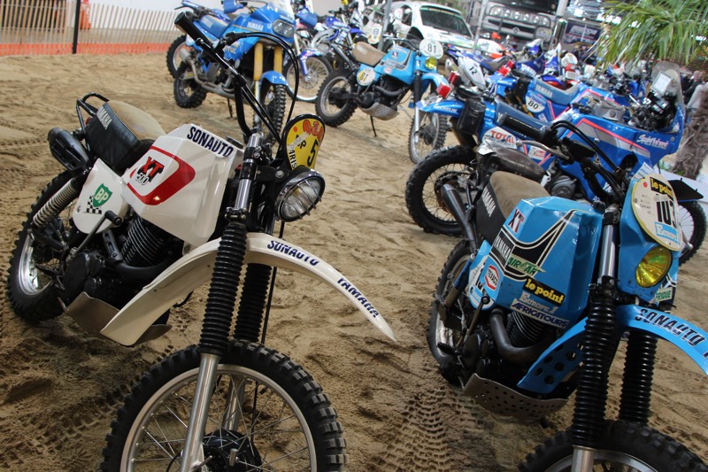 On entre sur la salon par une exposition des machines qui ont marqué les 24 heures du Mans moto. Une bonne cinquantaine sont alignées derrière les tourniquets qui nous laissent entrer. Il manque quelques explications pour les curieux mais l'ambiance sonore qui accompagne cette exposition évite de la transformer en nature morte. Autre hall, autre ambiance sonore et autre ambiance tout court sur l'exposition de rétro motocross avec de superbes machines de tous les âges ou presque. Un peu plus loin, on s'attarde sur le bivouac du Dakar avec les très nombreuses machines Yamaha et d'autres gloires comme la Cagiva Lucky Explorer ou les BMW. Plus étonnant et bien plus rare, la concentration des machines de side-car cross. WASP, Ducati, KTM, et autres sont là avec d'improbables modèles. Et puis on finit dans un autre hall par l'exposition des motos de Steve McQueen pas loin du stand Triumph avec lesquelles il roulait régulièrement, souvent pour le sport mais pas forcément pour la compétition, mais aussi Honda, Husqvarna et autres pour le Challenge One.