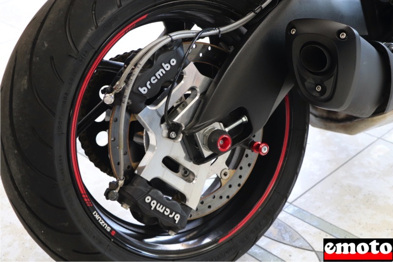 Crash bar sur la GSXR 600Frein arrière à la mainGuidon droit avec maitre-cylindres rentrésMontage des freins arrière au pied et à la mainRéservoir avec mousse antidérapanteSelle passager pour mettre le pied