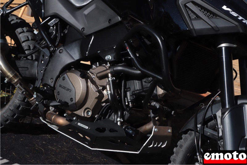 Il y a un kit de rehausse des suspensions pour gagner en garde au sol. Les jantes de 21 pouces à l'avant et 18 pouces à l'arrière sont chaussées de pneu Metzeler Karoo Extrême. Les durites sont des durites aviation. Les protections sont signées SW Motech ainsi que la selle qui a été refaite. Cette moto est facturée 16970 euros TTC et vous gardez les pièces d'origine si vous voulez revenir en arrière au moment de la revente par exemple.