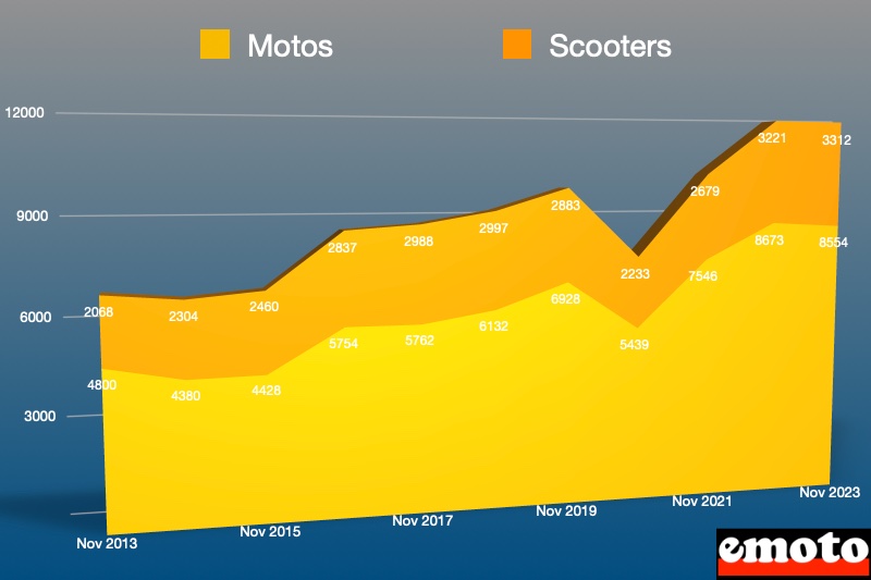 Le chiffre record de ventes sur les 10 dernières années mais de seulement 35 machines, est le mois de novembre 2022 avec 11902 deux-roues motorisés immatriculés sur le marché français. Pour novembre 2023, le nombre total de deux-roues motorisés vendus est à peine moins avec 11867 motos et scooters immatriculés.