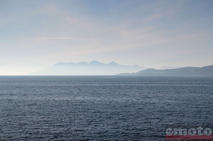 Le rythme ayant été jusque là un peu retardé par les arrêts photographiques, on ne s'attarde guère et on file plein sud vers l'ile de Skye, accessible par un pont, puis on descend à Armadale, prendre un ferry, non sans avoir chargé trois motos dans la camionnette d'assistance puisque leur nombre est limité sur le bateau. Ce dernier nous emmènera à Mallaig, en une petit traversée de trois quart d'heure, l'occasion de se poser un peu, humer l'air marin, et d'entrevoir quelques dauphins jouant à la proue du navire.