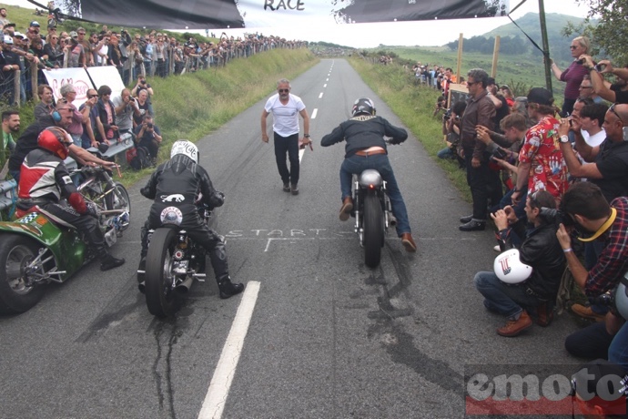 Le sprint se dispute en montagne. La route grimpe mais fait surtout un S, léger mais suffisant pour que la machine de tête se place devant la poursuivante. Autant dire qu'ici plus qu'ailleurs le départ est ultra important car il est totalement utopique de compter remonter dans la seconde partie. On peut s'aligner au départ avec n'importe quelle machine et n'importe quel équipement aussi, enfin pas tout à fait non plus, un minimum de protection est obligatoire. Scrambler, Cafe Racer, Trail, Sprinter, etc, on trouve de tout sur la grille de départ et de toutes les marques : BMW, Moto Guzzi, Triumph, Harley-Davidson et quelques rares japonaises. Toutes les machines sont customisées, aucune n'est d'origine comme dans le village à Biarritz.