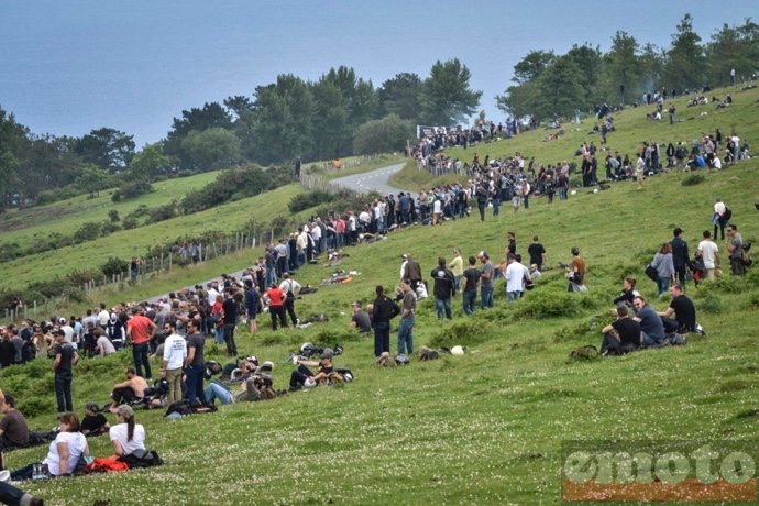 Côté spectateur, on trouve tout en haut du champ une buvette pour se restaurer avec des grillades et bien entendu, une part de l'incontournable gâteau basque pour le dessert. On n'est pas monté jusque là pour manger un moelleux au chocolat non plus. On s'installe dans le champ avec l'océan au loin et les motos qui déboulent en donnant tout ce qu'elles peuvent. Un peu comme nous allongés dans l'herbe sous un soleil réconfortant après les orages de la veille. Le truc chouette sur la Punk's Peak Race est qu'on peut même aller sur la grille de départ à quelques centimètres des pilotes. C'est conviviale et change radicalement des ambiances des compétitions qu'on connait actuellement où le spectacle est de plus en plus inaccessible. Aux Wheels and Wave et particulièrement sur la Punk's Peak Race dont l'accès est totalement gratuit, on approche sans souci des machines et des pilotes.