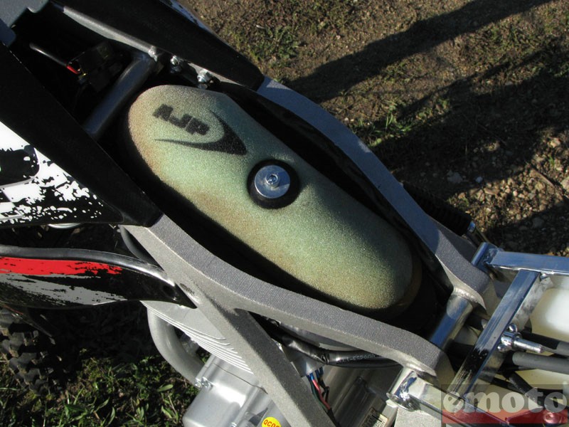 Côté pratique, l'AJP 125 PR4 Enduro est équipée d'un afficheur digital pour le tableau de bord. L'accès au filtre à air et à la batterie (sur le devant du cadre) se fait en enlevant la selle. Cette manipulation nécessite d'utiliser une petite clé.