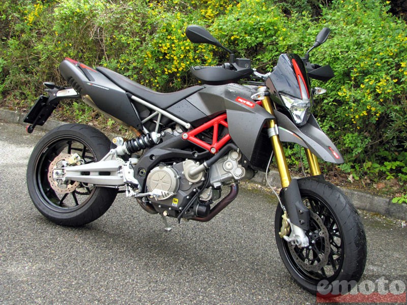 comme l'appelle certains c'est le supermotard de chez Aprilia. Une jolie machine développée autour du moteur de la Shiver : un bicylindre de 750 cm3 plutôt pêchu et géré par un accélérateur électronique et non pas par câble.