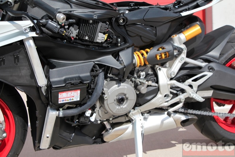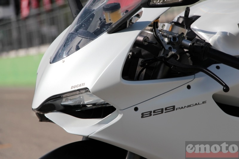 Côté design il n'y a pas de différence entre les deux Panigale à l'exception du monobras qui laisse sa place à un élément plus classique sur notre 899. Ce coloris blanc est associé à des jantes rouges. On retrouve une poupe très haute avec les deux feux en opposition qui offrent une signature lumineuse reconnaissable entre mille juste en-dessous de la selle passager qui va jusqu'à l'extrémité de la machine. La selle du pilote est plus haute de 0.5 cm et rapprochée du guidon de 3 cm. Le guidon est 1 cm plus haut pour offrir une ergonomie plus agréable pour un usage routier en étant du coup moins sur les poignets sur circuit, il faut se replacer lors des relances pour rester au fond de la selle qui nous pousse vers le réservoir. Le côté droit du carénage laisse apparaître la tubulure du collecteur d'un cylindre, l'autre fait une boucle sous le cache en plastique juste au-dessus du bras oscillant. Tout ceci se rejoint dans les silencieux placés sous la moto. Le côté gauche laisse nettement apparaître l'amortisseur Sachs totalement réglable tout comme la fourche Showa. Les grandes optiques à l'avant sont identiques à ceux de la 1199 s'intégrant parfaitement dans cet étroit carénage et le prolongement de la petite bulle qui n'offrent que très peu de protection lorsqu'on mesure 1.80 m. Il faut complètement se coucher sur le réservoir pour réduire les turbulences sur le casque. On termine ce petit tour par le tableau de bord entièrement digital qui affiche toutes les informations nécessaires ainsi que les différents réglages électroniques proposés : l'ABS sur 3 niveaux, le frein moteur et le contrôle de traction sur 8. Tout ceci est regroupé dans 3 modes préprogrammés Race, Sport ou Pluie et se commande depuis le guidon gauche. Enfin, le freinage est uniquement disponible avec l'ABS, uniquement sur l'avant en mode Race avec les étriers radiaux monoblocs.