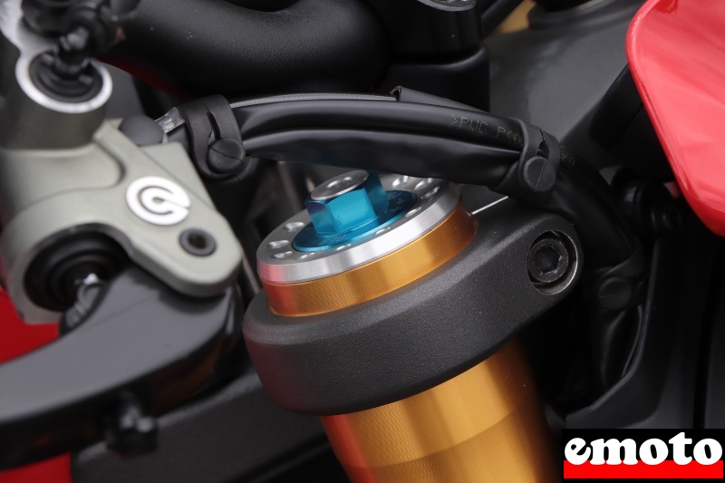 Il faut reconnaître qu'elle a une sacrée gueule avec sa livrée inspirée du MotoGP, c'est bien plus joli que les finitions unies qu'on connait sur la standard. Le cadre treillis n'est plus là sur cette dernière génération de Monster puisqu'on a un cadre en deux parties sur un moteur porteur. La partie avant est en aluminium alors qu'à l'arrière, c'est une boucle en fibre de verre et polymère pour un poids de l'ensemble réduit d'un peu plus de 6 kg par rapport au treillis. Si on ajoute la réduction du poids du bras oscillant, des jantes et du moteur, on perd pas loin de 20 kg, 18 précisément, par rapport à l'ancienne génération alors en proposer une version encore plus joueuse est une excellente idée.