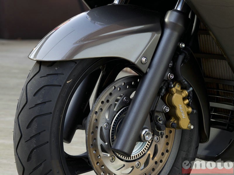 Esthétiquement, on retrouve exactement le 400 avec les optiques profilés, le pare-brise intégré, les traits de l'habillage élancés et le becquet à l'arrière. L'ensemble très protecteur et accueillant ne manque pas d'élégance pour ce scooter haut de gamme, cossu et valorisant. L'assise du pilote et du passager sont excellentes. Il n'y a pas le choix de la position des pieds que ce soit contre le tablier ou sur le plancher, mais les grands seront à l'aise et ceux qui ont des jambes plus courtes apprécieront certainement la hauteur de selle raisonnable vu le gabarit de ce scooter, à 755mm. Le pilote profite d'un support lombaire qui n'empiète pas sur la selle passager pour préserver le confort de chacun. Le passager est particulièrement bien traité aussi avec des repose-pieds escamotables pas trop éloignés, une large selle, deux grandes poignées et également un support lombaire pour pouvoir attaquer les longs trajets. C'est un des aspects mis en avant par Honda : la possibilité de voyager loin après avoir utiliser son scooter toute la semaine pour aller au bureau. Il faut reconnaître qu'entre la protection et l'accueil à bord, c'est parfaitement envisageable avec cette motorisation véloce et feutrée à la fois. Il faut juste veiller à garder un bon régime moteur pour profiter de la vivacité du bloc qui annonce 51.2ch à 7500tr/min et 55Nm à 6000tr/min. Comme sur le 400, le SW-T 600 se distingue par une partie cycle très sécurisante qui sait toute de même rester maniable, si on fait abstraction de l'encombrement de ce scooter dans les embouteillages... Combiné à la bonne santé du twin parallèle, le SWT (T pour Twin donc...) reste dynamique même si les 12 chevaux supplémentaires ne semblent pas changer grand-chose en ville sur les reprises et lors des démarrages aux feux. L'intérêt se trouve plutôt sur les grands axes où le moteur tourne un peu moins vite à un régime stabilisé, gage de moins d'usure et de consommation réduite. Enfin, outre son excellente stabilité, le SWT 600 est uniquement disponible en France avec le freinage ABS combiné (C-ABS) qui convient parfaitement à l'usage de ce scooter.