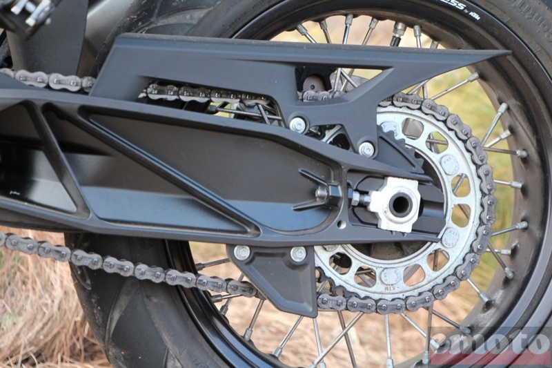 ce qui permet de bloquer la roue arrière pour faire pivoter la machine ou plus simplement faire patiner la roue dans les grandes courbes. L'ABS combiné avant/arrière ne fonctionne donc que sur les autres modes pour le bitume. L'avant semble avoir peu de mordant, mais le résultat est efficace et l'intervention de l'ABS s'est montrée discrète. Le frein arrière est automatiquement actif lorsqu'on tire le levier pour l'avant. C'est pratique mais n'empêche pas d'importantes variations d'assiette en montagne sur les freinages appuyés et les relances franches. Le phénomène est tout de même moins présent que sur l'ancienne Adventure, la nouvelle étant plus routière. Pour palier ce phénomène, la solution est de changer la précharge depuis le guidon gauche avant de s'élancer, par exemple en mettant un passager ou un bagage, voire les deux pour limiter au maximum les variations d'assiette lorsqu'on roule seul, mais le confort y perd.