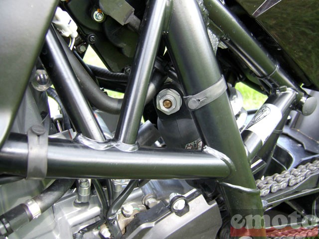 L'échappement ne gâche en rien la ligne de la "Duke", puisque celui-ci se trouve en position basse, sous le moteur, libérant ainsi l'arrière de la moto très réussi et abaissant significativement le centre de gravité. En revanche, la sonorité du monocylindre n'est pas au rendez-vous et au ralenti la "Duke" reste timide