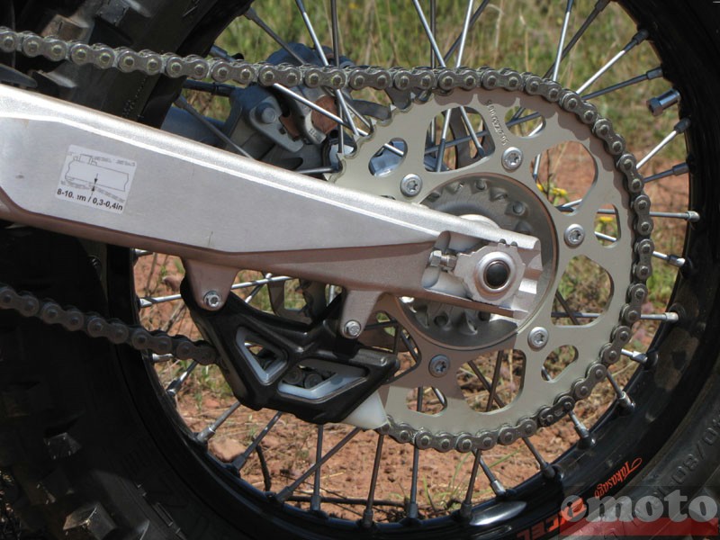 non plus même si cette année, les cross 2 temps restent avec le PDS. A suivre donc sachant que l'installation de biellettes entraine des modifications plus profondes puisqu'il faut changer le bras oscillant, le cadre et la boucle arrière. La fourche conserve les spécificités de l'année dernière qui rendaient cet élément bien plus confortable pour l'enduro, surtout lorsqu'on ne cherche pas forcément à faire un temps dans les spéciales du WEC... Le freinage est puissant à l'arrière où on bloque assez facilement la roue. Sur l'avant, le frein possède une attaque très franche alors qu'une fois cette phase passée, le feeling est fin et la pression facilement dosable.