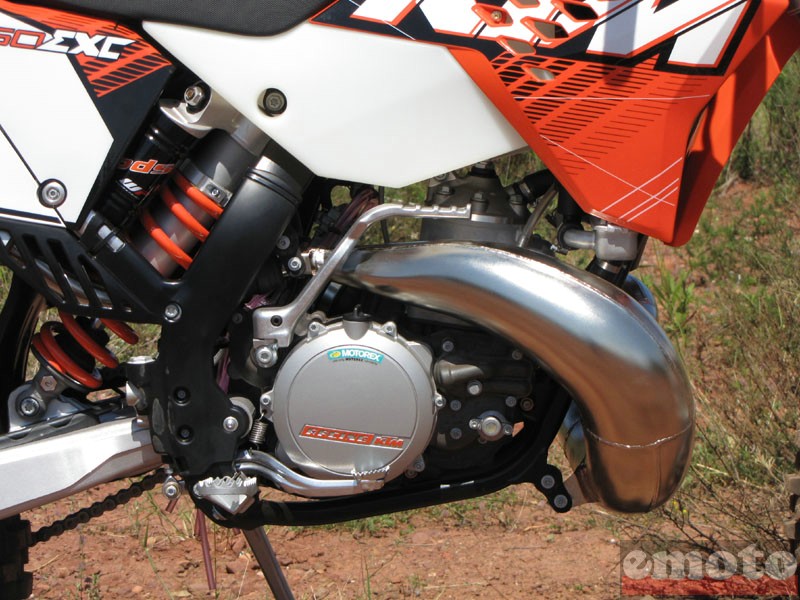 Parmi les KTM Enduro qui connaissent peu d'évolutions pour 2011, la 250 EXC est une de celles qui évolue le plus. En 2010, elle avait reçu quelques améliorations au niveau du piston, un démarreur électrique, un échappement renforcé (plus épais) et bien entendu tous les changements apportés aux suspensions des EXC qui devenaient bien moins fermes et beaucoup mieux adaptées à un usage Enduro. Pour cette année, on ne verra pas apparaître les biellettes ou l'injection comme c'est le cas sur la toute nouvelle SXF 350, la main de Stefan Everts est restée confinée sur la gamme KTM Cross. Pour 2011, toute la gamme EXC et EXC-F reçoit des nouveaux coloris, une nouvelle déco, une mousse de guidon, un réservoir transparent et des protège-mains de série, ceux qui étaient au catalogue PowerParts avant. L'EXC 250 connaît des modifications sur son moteur, son échappement et sa boîte de vitesses, puisque la boîte 5 laisse la place à une boîte à 6 rapports pour 2011. Le moteur de la 250 reçoit cette année un nouveau cylindre pour donner plus de couple, un nouveau piston et de nouveaux réglages de carburateur. L'échappement et le silencieux sont également changés sur cette EXC pour favoriser le couple et il est possible de choisir son mapping d'allumage. On remarque au passage le nouveau système de fixation qui ne fait pas l'unanimité esthétiquement mais qui apporte sans aucun doute un meilleur maintien de cet élément sur la machine pour résister aux vibrations et aux gros chocs.