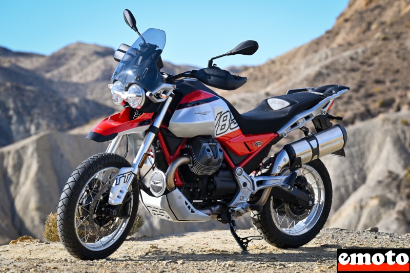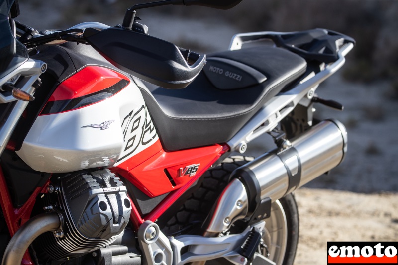 A la conduite, on ne peut pas dire que la différence soit très importante avec la première V85TT. C'est un moteur à l'ancienne que nous propose Moto Guzzi même s'il est Euro5+, très rond qui peut être vigoureux sans excès, mais ce n'est pas là qu'on va en profiter. Avec des valeurs comparables à la précédente génération, on profite d'un couple important vers 3500 tr/min jusqu'à 6000 environ avec une admission variable qui en donne un peu plus à mi chemin. Inutile d'aller chercher la puissance dans les tours, ce n'est pas l'esprit de cette moto même si on profite de plusieurs modes de conduite plus ou moins réactifs. C'est une machine qui se pilote sur le couple, tout en douceur en arrondissant les courbes et les trajectoires pour garder le régime moteur idéal. C'est une conduite à l'ancienne qui ravira ceux qui aiment flâner à bon train bercés par le son du bicylindre transversal.