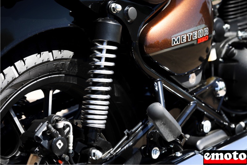Le 500 longue course était à injection avec un allumage électronique à la fin de sa carrière et un démarreur électrique en plus du kick qui peut toujours dépanner si on n'a plus de batterie. Il n'y en a plus sur le 350 qui démarre uniquement avec la pression sur le bouton. Il est refroidi par air et huile, a 2 soupapes et c'est toujours un longue course. Proportionnellement, il est même un peu plus longue course qu'avant. Malgré la modernisation de ce monocylindre, il n'est pas plus performant que l'antique 500. Il l'est même moins puisqu'on passe de 27,2 chevaux à seulement 20 chevaux. C'est ce que proposait un 250 il y a une dizaine d'années. Royal Enfield voulait garder l'ambiance au guidon avec sa Meteor.