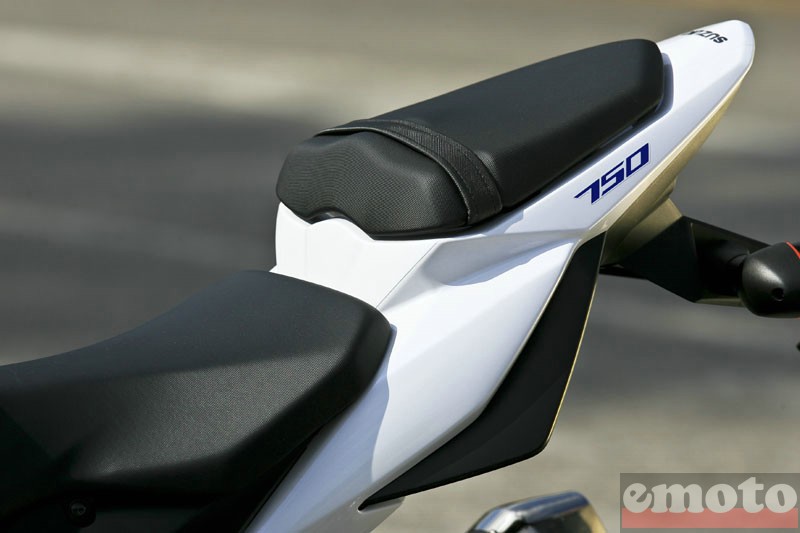 Pour l'équipement et les aspects pratiques, la nouvelle Suzuki GSR 750 propose par contre un menu moins alléchant, mais ce n'est pas vraiment pénalisant face à la concurrence qui fait rarement mieux. La place sous la selle peut accueillir quelques petites choses sans plus, on remarque en revanche les petites sangles sous la selle et les ergots derrière les repose-pieds du passager (non caoutchoutés) pour maintenir quelques sandows. Ce qui est en revanche très complet et parfaitement fonctionnel, c'est tableau de bord. Si son style conventionnel dénote avec le reste du dessin de la machine plus affirmé, on trouve dessus toutes les informations utiles et elles sont parfaitement lisibles : rapport engagé, 2 trips, et même la consommation moyenne qui affichait fièrement entre 5.9 et 6.1 litres aux 100km sur les 9 machines présentes... un chiffre (non vérifié) étonnant vu le bon rythme tenu avant la pause de la mi journée.