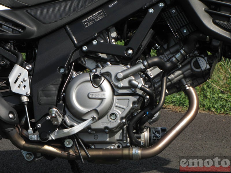 Pour la motorisation, on retrouve le V-Twin à 90° de 645cm3 de la Gladius avec quelques modifications pour l'ajuster à l'esprit de cette machine bonne à tout faire depuis la ville jusqu'à l'autoroute en passant par les pistes. Sur la fiche technique, la puissance maxi passe ainsi de 72 à 69 chevaux et le couple de 6.4 à 6.0 mkg. A l'usage le bicylindre se montre particulièrement souple à bas et mi régimes, on peut facilement rouler un rapport au-dessus pour consommer moins ou par exemple gérer plus facilement l'adhérence sur une piste glissante. C'est assez étonnant pour un twin d'être aussi lissé en bas, mais pas désagréable pour se balader nez au vent si on fait abstraction de la sonorité peu flatteuse en selle alors qu'à l'échappement, ce n'est pas si désagréable ... Inutile d'aller titiller les haut-régimes pour profiter du V-Twin parce que cela n'apporte pas grand-chose de plus qu'entre 6 et 7000tr/min en terme d'agrément, qu'on consomme plus, mais aussi parce qu'on atteint rapidement le régime maxi obligeant à sans cesse jouer de la boîte. L'idéal est donc de tenir son rythme à mi-régime et de se laisser porter par une partie-cycle réussie. La fourche et l'amortisseur absorbent très correctement les imperfections de la route et la machine fait preuve d'une belle stabilité en courbe rapide sans pour autant négliger la maniabilité dans des virages plus serrés. La prise en main est immédiate et le sentiment de sécurité rapidement instauré. C'est également le cas pour le freinage avec une combinaison avant / arrière efficace et un ABS qui veille sans trop intervenir lors d'un freinage puissant sur une chaussée bosselée ou même hors du bitume. Stable sur autoroute, efficace sur le réseau secondaire en bon état ou pas, la V Strom étonne aussi sur les pistes. Terre, sable et même cailloux, en plaine ou en sous-bois, la Suzuki se révèle facile à emmener malgré ses 214kg à sec. On profite de la souplesse de son moteur pour la motricité, des suspensions bien accordées et d'un freinage aisément dosable pour tenir une bonne moyenne dans les chemins roulants. Bien entendu, les pneus plutôt orientés route