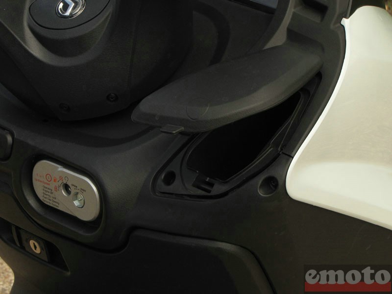 Côté pratique, comme dans les monospaces, Sym a placé des vide-poches partout ! Il y en a un sous le guidon (l'ouverture n'est pas pratique), un avec deux compartiments dans le plancher devant la selle et un dans le tablier qui ferme à clé. Le coffre sous la selle s'ouvre électriquement avec un bouton au guidon ou avec la clé. L'ouverture du coffre éclairé est grande, on y place facilement une raquette de squash, en revanche son étroitesse n'accueille qu'un ordinateur 13". Pas simple donc de placer sa sacoche. De même un seul casque trouve sa place dans le coffre, la partie avant est encombrée par une bosse au fond qui empêche d'en placer un second, même un jet ne rentre pas. Pour recharger son portable, une prise 12V est disponible dans le vide poche qui se situe dans le tablier. Pour la curiosité, on notera le bouchon de réservoir sur ressort qui s'éjecte (mais ne tombe pas) depuis le contacteur multifonction et la présence d'un feu antibrouillard. Le tableau de bord est complet comme on s'y attend sur un maxi scooter, un afficheur digital permet d'avoir l'heure et la jauge de carburant en plus des totalisateurs. La vitesse et le compte-tours sont tous deux à aiguille.