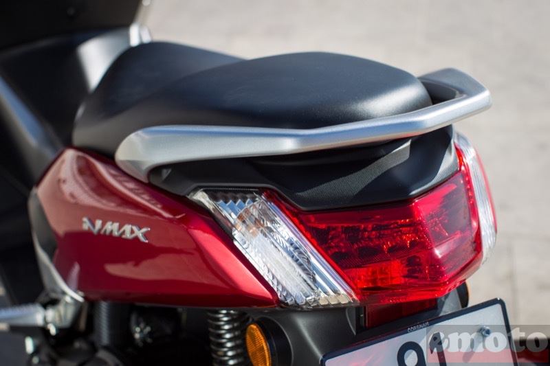 L'arrière est plus classique avec le grand feu et la grande poignée pour le passager mais les clignotants sont intégrés. Le N-Max 125 propose un selle pas trop haute et relativement spacieuse qui convient à tous les gabarits. C'est également le cas pour l'espace réservé aux pieds dans le tablier. A l'aplomb des fesses ou devant, contre le tablier, on peut mettre ses pieds comme on le souhaite sans que les genoux ne viennent contre le carénage ou le guidon lorsqu'on braque au maximum, c'est parfait et pas si courant sur un scooter de cette taille.