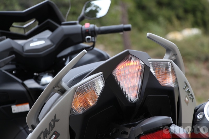 Dans ses grandes lignes, le TMax ne change pas. On retrouve l'avant plongeant, le boomerang central et l'arrière fuyant. La poupe avec le feu inspiré de celui de la R1 actuelle est inchangée. C'est la face avant qui change avec un nouveau carénage. Le feu de position est remplacé par un déflecteur pour réduire (très peu) les turbulences sur le casque du pilote. Les rétroviseurs redessinnés sont portés par des bras plus longs pour une meilleure visibilité.