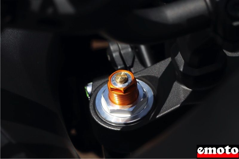 Comment est-ce possible en gardant strictement la même partie-cycle et géométrie que la MT ? Tout simplement avec une autre selle un peu plus haut de 3,5 cm et un guidon plus large de 3,4 cm qui donne un tout autre ressenti une fois en route. On est bien au guidon, avec une position toujours décontractée et, même si l'angle de chasse augmente un tout petit peu, une conduite très facile.