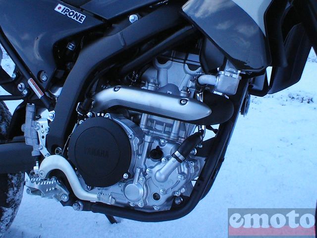 Ce bloc de 250cm3 se démarre avec un démarreur électrique, cette Yamaha WR250R n'étant pas équipée de kick . Il délivre sa puissance maximale à 10000tr/min. Si les bas régimes ne le rebutent pas, ce n'est pas là qu'il est le plus souvent utilisé. Le régime de croisière se situe plus généralement entre le moyen et haut régime. Le haut régime est sollicité dès qu'il s'agit d'attaquer une difficulté en tout-terrain. Le mi régime se cantonnera à un usage moins ludique idéal pour celui qui souhaite randonner dans les chemins sans aligner les chronos.