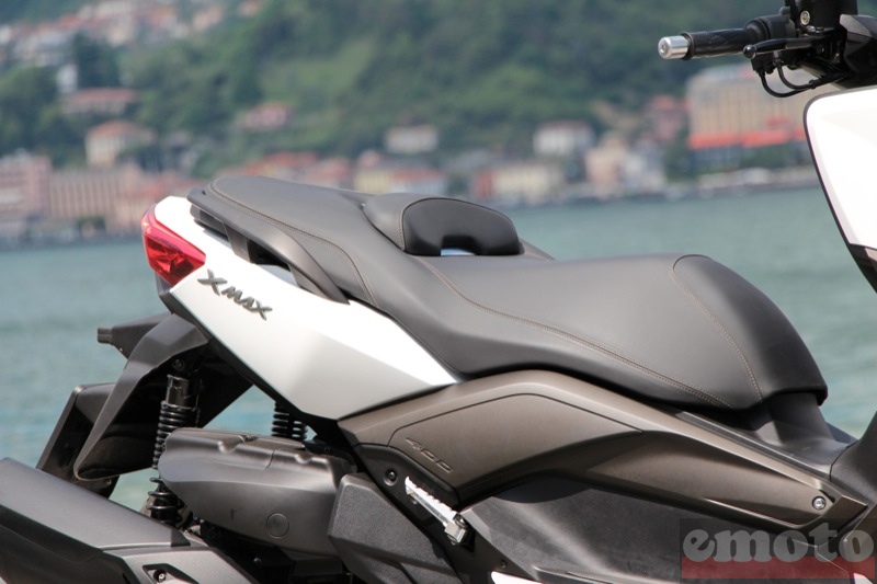 sur son côté mais il ne s'agit sur celui-ci que de décoration puisque le cadre en tube d'acier est tout-à-fait conventionnel, tout comme la disposition du moteur dans le bras oscillant. La selle d'un seul tenant avec ses surpiqures et un petit dosseret est large et haute. A 785 mm, elle est 25 mm plus haute que celle du Majesty mais 7 de moins que celle du X-Max 250. Le X-Max réclame d'avoir de longues jambes. En mesurant 1.80 m, les commandes tombent bien sous les mains et les jambes peuvent être posées contre le tablier ou à l'aplomb des genoux au choix. Le tableau de bord s'inspire du T-Max, mais l'intérieur est celui d'un X-Max avec une petite différence dans l'afficheur numérique. Parfaitement lisible, il affiche en effet en permanence la jauge, l'heure et la température ambiante. Inutile d'appuyer sur un bouton pour la voir contrairement au 250. La poupe du 400 est spécifique avec des feux larges qui donnent du volume à ce scooter tout en conservant un certain dynamisme avec des traits fuyants. En-dessous, c'est exactement la même chose que sur le Majesty puisque les deux engins partagent le même moteur. Le silencieux est différent mais les volumineuses boîtes