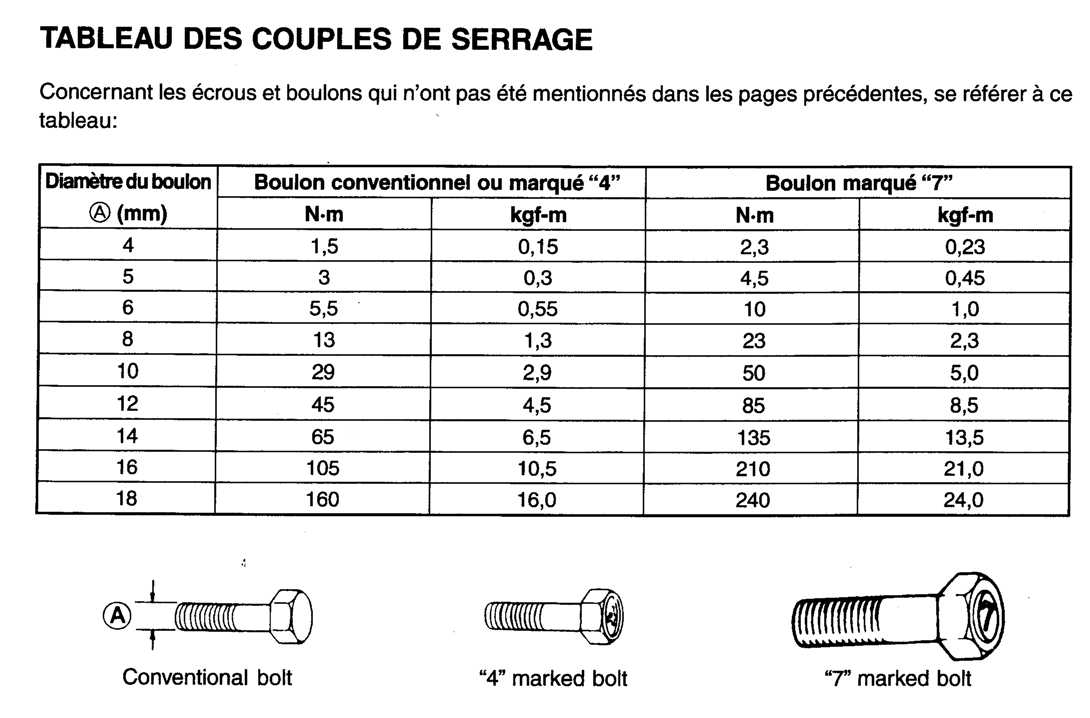 ATTENTION, les couples donnés ci dessous sont les couple de serrage que peuvent supporter les vis et pas obligatoirement ce qu'il faudra pour une cullasse ou un étrier de frein. En claire c'est le couple à ne pas dépasser pour ne pas casser la vis
