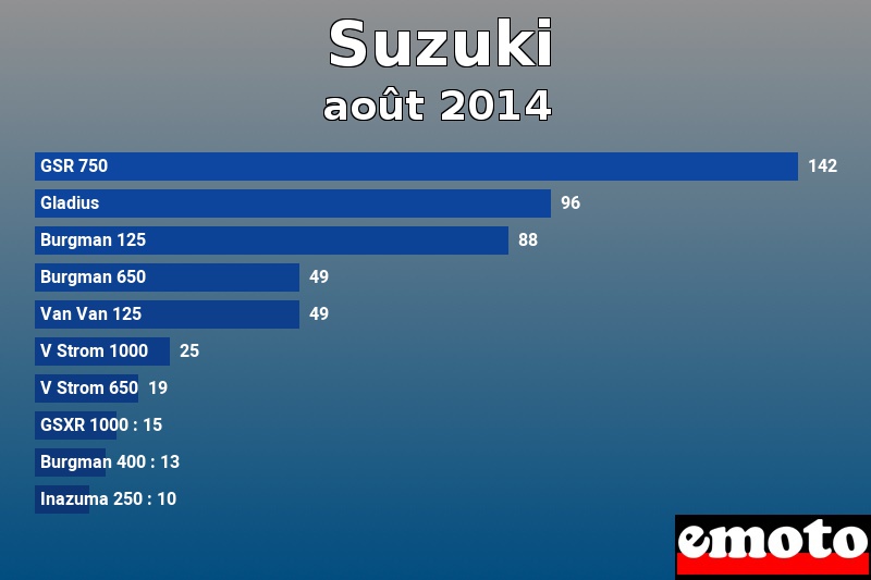 Le volume des immatriculations Suzuki neufs en France au mois de août 2014 est de 562 unités selon les chiffres AAA Data. C'est une baisse de 135 deux-roues par rapport à la même période l'année précédente. Sur le podium : GSR 750, Gladius et Burgman 125.