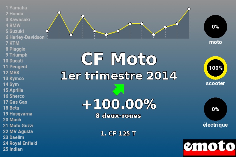 Le volume des immatriculations CF Moto neufs en France au 1er trimestre 2014 est de 8 unités selon les chiffres AAA Data. C'est une hausse de 4 deux-roues par rapport à la même période l'année dernière.
