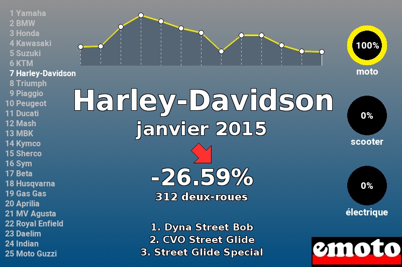 Le volume des immatriculations Harley-Davidson neufs en France au mois de janvier 2015 est de 312 unités selon les chiffres AAA Data. C'est une baisse de 113 deux-roues par rapport à la même période l'année précédente. Sur le podium : Dyna Street Bob, CVO Street Glide et Street Glide Special.