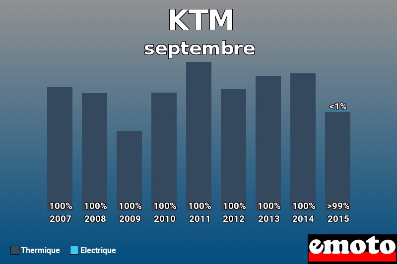 Le volume des immatriculations KTM neufs en France au mois de septembre 2015 est de 395 unités selon les chiffres AAA Data. C'est une baisse de 148 deux-roues par rapport à la même période l'année précédente. Sur le podium : Duke 125, EXC F 300 et EXC 125.