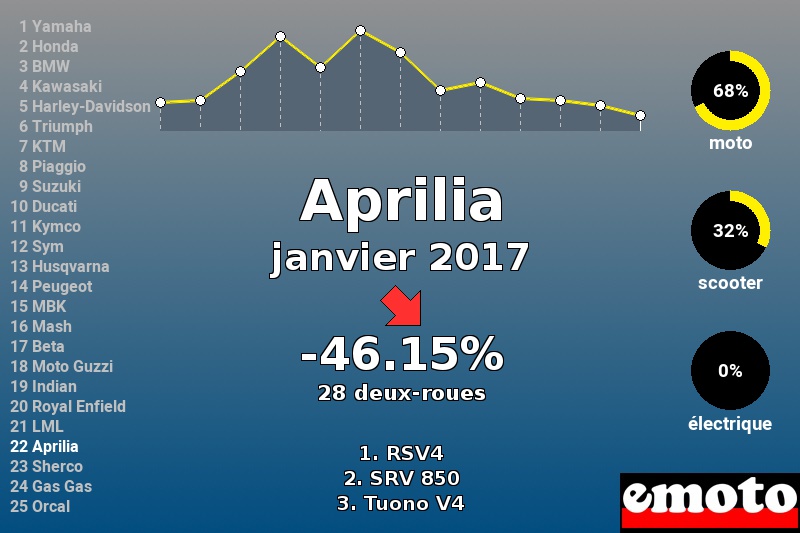 Le volume des immatriculations Aprilia neufs en France au mois de janvier 2017 est de 28 unités selon les chiffres AAA Data. C'est une baisse de 24 deux-roues par rapport à la même période l'année précédente. Sur le podium : RSV4, SRV 850 et Tuono V4.