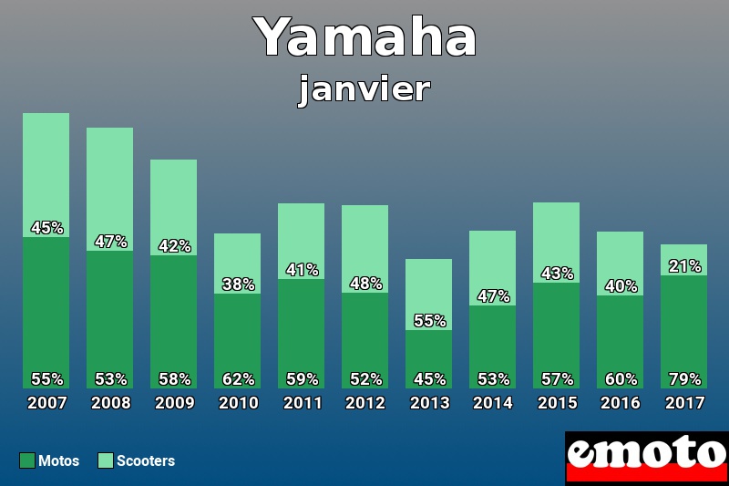 Le nombre record d'immatriculations sur une période comparable sur une période de 10 ans est le mois de janvier 2007 avec 2735 deux-roues motorisés immatriculés sur le marché français. Au mois de janvier 2017, le nombre total de deux-roues motorisés immatriculés est de 1431 unités soit 1304 immatriculations de moins.