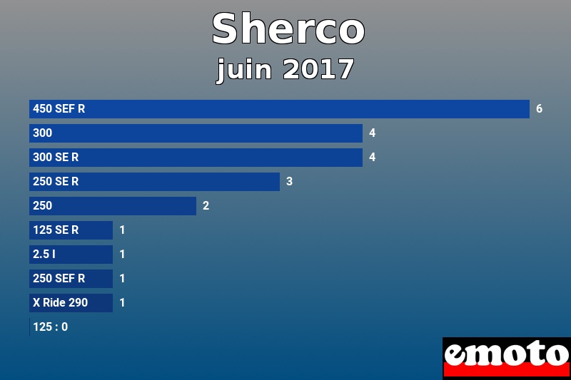 Le volume des immatriculations Sherco neufs en France au mois de juin 2017 est de 23 unités selon les chiffres AAA Data. C'est une baisse de 27 deux-roues par rapport à la même période l'année précédente. Sur le podium : 450 SEF R, 300 et 300 SE R.