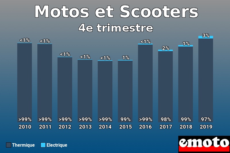 Le nombre record d'immatriculations sur une période comparable sur une période de 10 ans est le dernier trimestre 2009 avec 33759 deux-roues motorisés immatriculés sur le marché français. Au 4e trimestre 2019, le nombre total de deux-roues motorisés immatriculés est de 33196 unités soit 563 immatriculations de moins.
