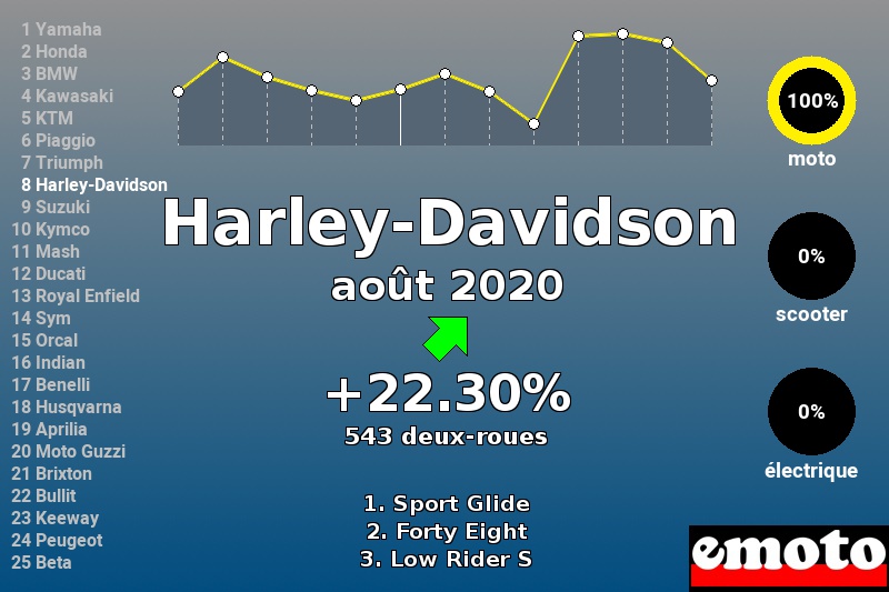 Le volume des immatriculations Harley-Davidson neufs en France au mois de août 2020 est de 543 unités selon les chiffres AAA Data. C'est une hausse de 99 deux-roues par rapport à la même période l'année précédente. Sur le podium : Sport Glide, Forty Eight et Low Rider S.