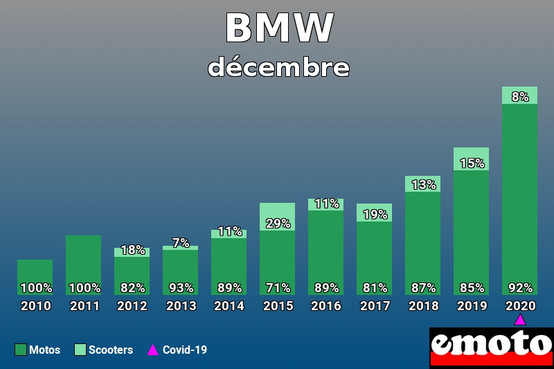 Le nombre record d'immatriculations sur une période comparable sur une période de 10 ans est le mois de décembre 2020 avec 1582 deux-roues motorisés immatriculés sur le marché français. Le mois de décembre 2020 est un record.