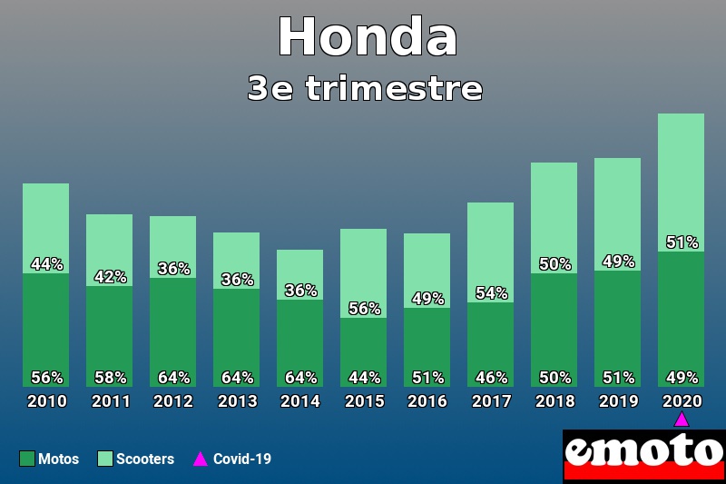 Le nombre record d'immatriculations sur une période comparable sur une période de 10 ans est le troisième trimestre 2020 avec 10116 deux-roues motorisés immatriculés sur le marché français. Le 3e trimestre 2020 est un record.