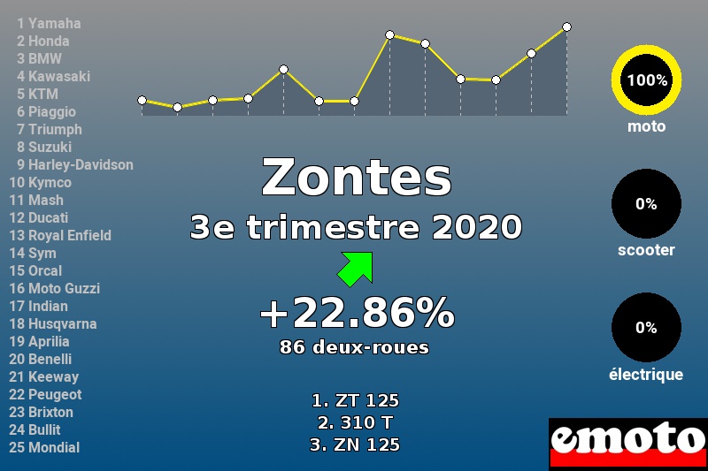Le volume des immatriculations Zontes neufs en France au 3e trimestre 2020 est de 86 unités selon les chiffres AAA Data. C'est une hausse de 16 deux-roues par rapport à la même période l'année dernière. Sur le podium : ZT 125, 310 T et ZN 125.