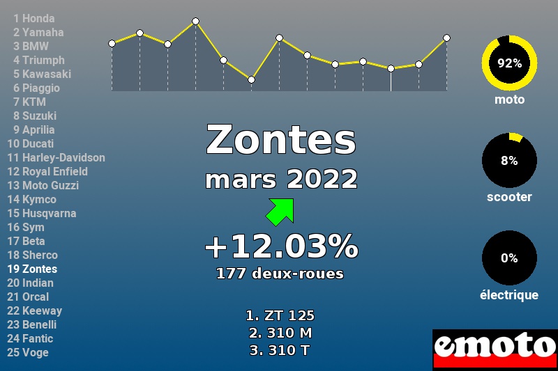 Le volume des immatriculations Zontes neufs en France au mois de mars 2022 est de 177 unités selon les chiffres AAA Data. C'est une hausse de 19 deux-roues par rapport à la même période l'année précédente. Sur le podium : ZT 125, 310 M et 310 T.
