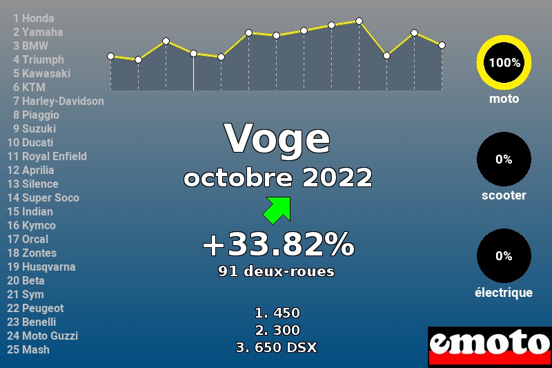 Le volume des immatriculations Voge neufs en France au mois de octobre 2022 est de 91 unités selon les chiffres AAA Data. C'est une hausse de 23 deux-roues par rapport à la même période l'année précédente. Sur le podium : 450, 300 et 650 DSX.