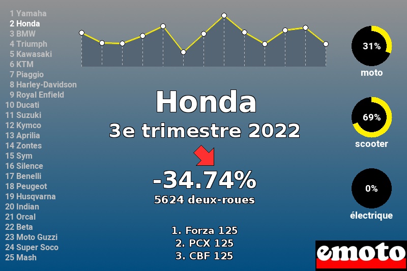 Le nombre record d'immatriculations sur une période comparable sur une période de 10 ans est le troisième trimestre 2020 avec 10116 deux-roues motorisés immatriculés sur le marché français. Au 3e trimestre 2022, le nombre total de deux-roues motorisés immatriculés est de 5624 unités soit 4492 immatriculations de moins.