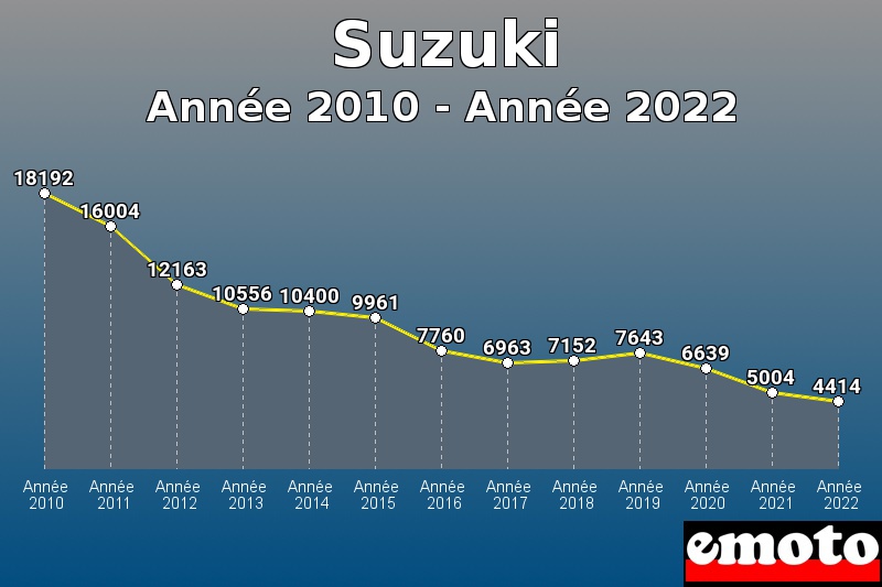 Le marché Suzuki sur l'année en France représente 4414 deux-roues selon les chiffres AAA Data. En 10 ans, entre 2012 et 2022, c'est au total 88655 deux-roues qui ont été immatriculés dont 4.98% en 2022.