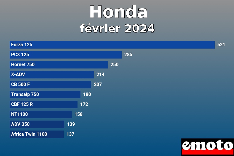 Le volume des immatriculations Honda neufs en France au mois de février 2024 est de 3496 unités selon les chiffres AAA Data. C'est une hausse de 387 deux-roues par rapport à la même période l'année précédente. Sur le podium : Forza 125, PCX 125 et Hornet 750.