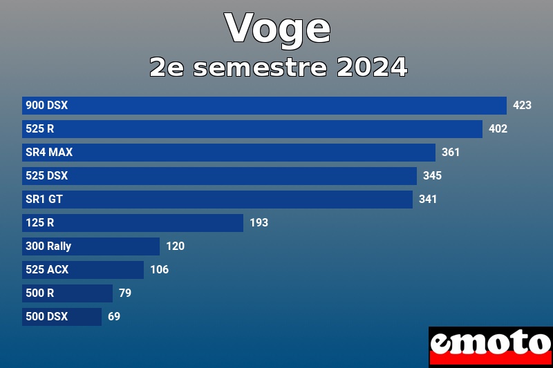 Le volume des immatriculations Voge neufs en France au 2e semestre 2024 est de 1498 unités selon les chiffres AAA Data. C'est une hausse de 597 deux-roues par rapport à la même période l'année dernière. Sur le podium : 900 DSX, 525 R et SR4 MAX.