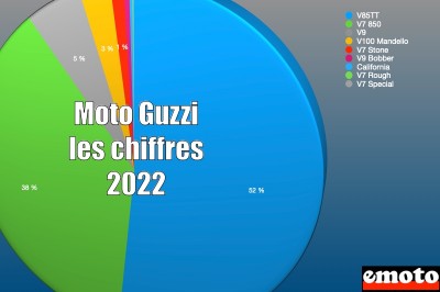 - Une belle progression avec 2 modèles pour Moto Guzzi qui est 20e en 2022 avec 1821 deux-roues vendus et une part de marché de 1%, c'est une baisse de 147 unités par rapport à l'année précédente. Les modèles les plus vendus sont la V85TT et la V7 850.